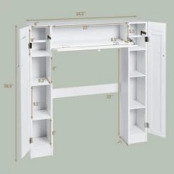 - Over toilet open shelving unit with side shelves dimensions: 39 in. W x 8 in. D x 48 in. H, bath storage shelf dimensions: 32 in. W x 15 in. D x32 in. H