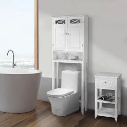- Over-the-toilet storage unit and bath storage shelf add style and utility to your bathroom space