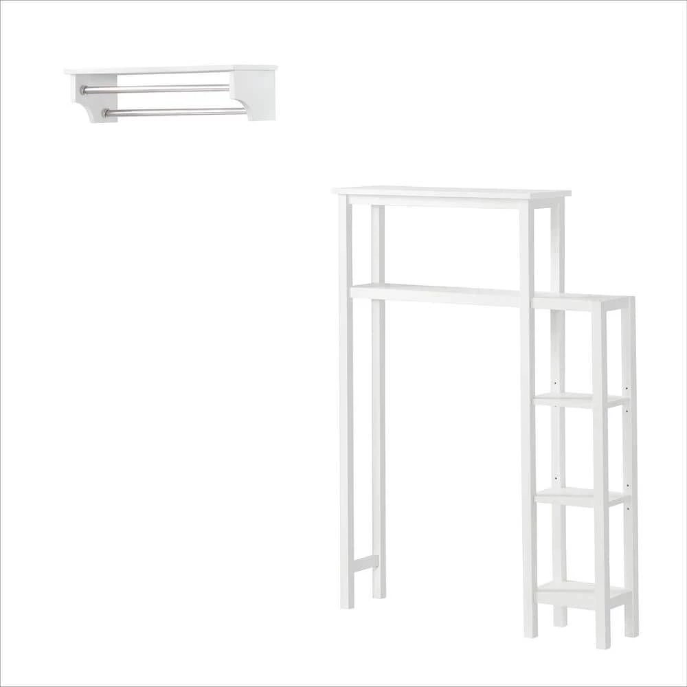 This collection brings space saving storage to your bathroom. The classic design compliments almost any bathroom decor. Wood construction with a white, painted finish, these pieces are designed for both style and functionality. A perfect space saver for your bathroom, over the toilet base space saver with side shelving allows you to store toiletries, washcloths and towels or display decorative accessories. The 27 in. W shelf provides space for decor or bathroom accessories and features 2-towel rods. Bath collection is moisture resistant.
