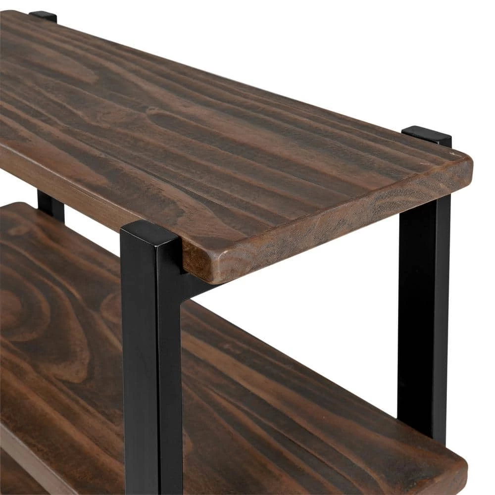 - Strong metal black legs support the solid wood shelves