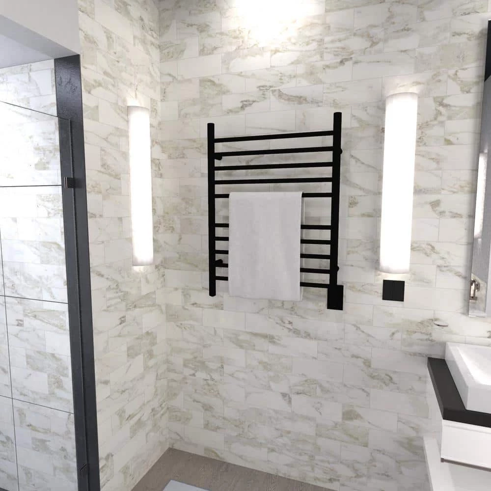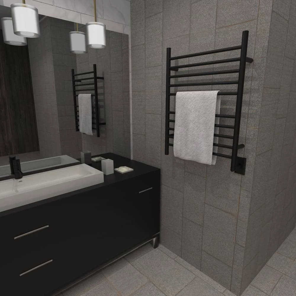 The Radiant collection features affordable, wall-mounted towel warmers. Wrap yourself in a warm, cozy towel or bathrobe after every bath or shower. Prevent your towel from developing that gross musty smell by drying it after every use and reduce how frequently you have to wash your towels. Choose between round or square bars as well as a shelf model; straight or curved horizontal bars, in a hardwired or plug-in variation – Amba has a style and size to fit all needs. Made of high quality 304 stainless steel, they are offered in a variety of finishes including brushed, polished, matte black and satin brass and feature integrated On/Off switches on the unit.