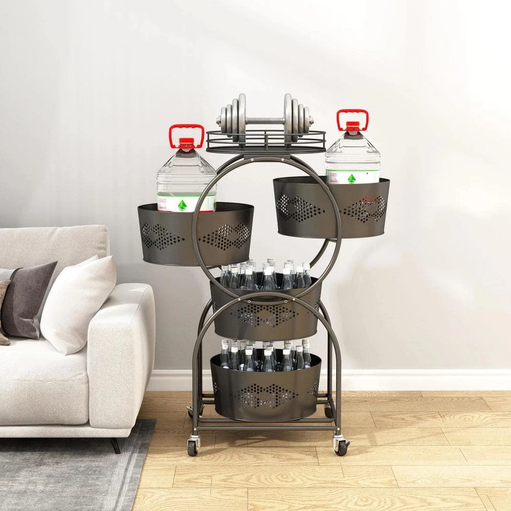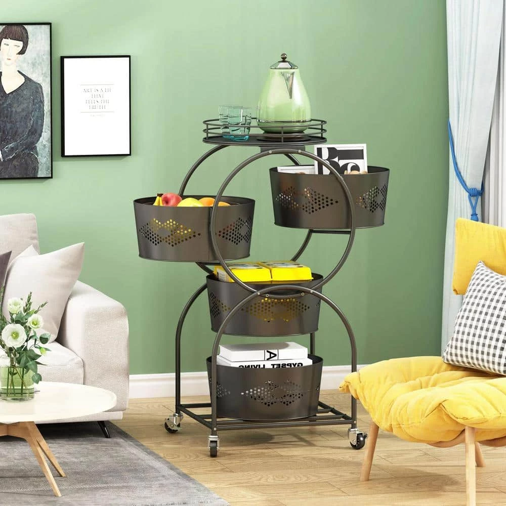 This versatile storage rack with baskets and top tray is made of stainless steel metal, each basket can be rotated to meet the various needs of your life. It can be used not only in the bedroom to store various books and documents, but also in the kitchen to store fruits and vegetables. The basket is hollowed out and ventilated to keep air circulation. The bottom has wheels for easy movement.