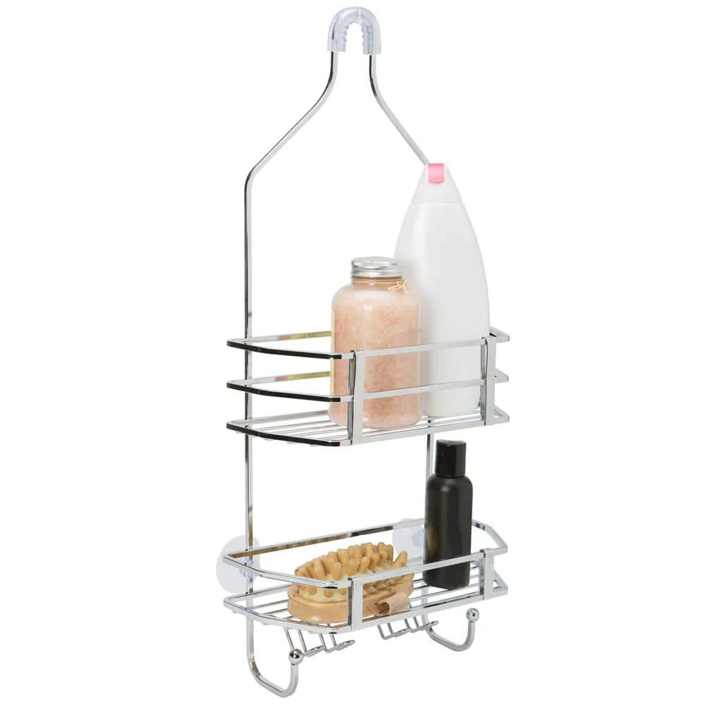 Keep your shower organized with the Bath Bliss shower caddy. Mounts easily over your shower head and with 2 suction cups this caddy stays stable keeping all of your items sturdy. Features 1 deep and 1 shallow basket for multiple storage options. Complete with 2 hanging hooks for towels and 4 built in hooks for razors and toothbrushes. The rust resistant iron construction design allows this item to last!