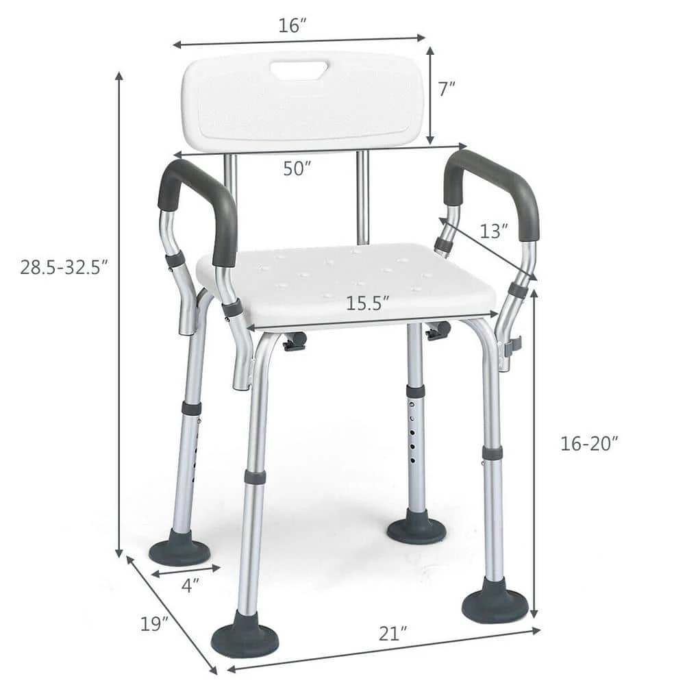 - 5 adjustable heights: you are allowed to adjust 5 different heights of this 16 in. to 20 in. shower chair to suit your needs, on the other hand, this adjustable design is perfect for people who are unable to stand during the shower, particularly the elderly, disabled, and injured