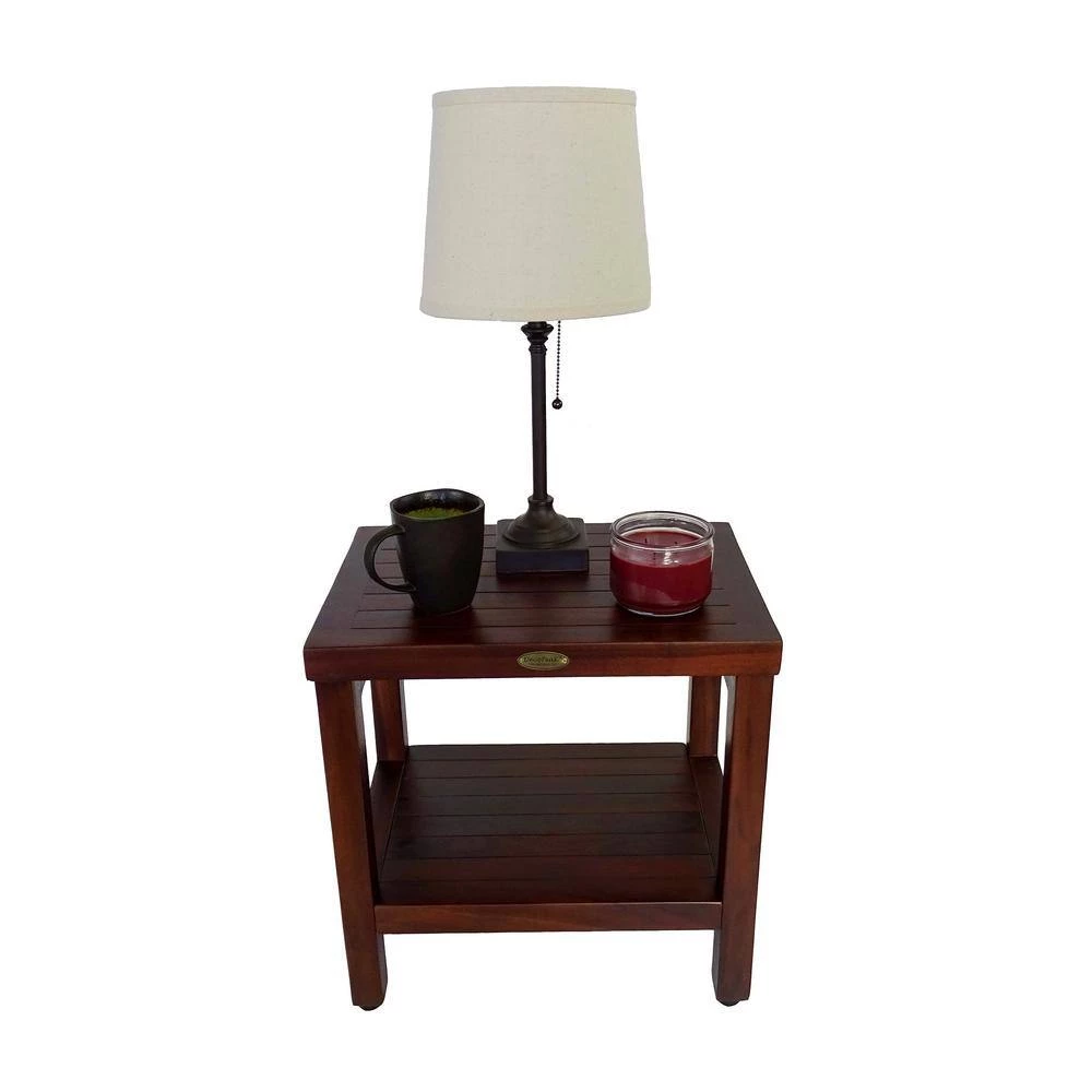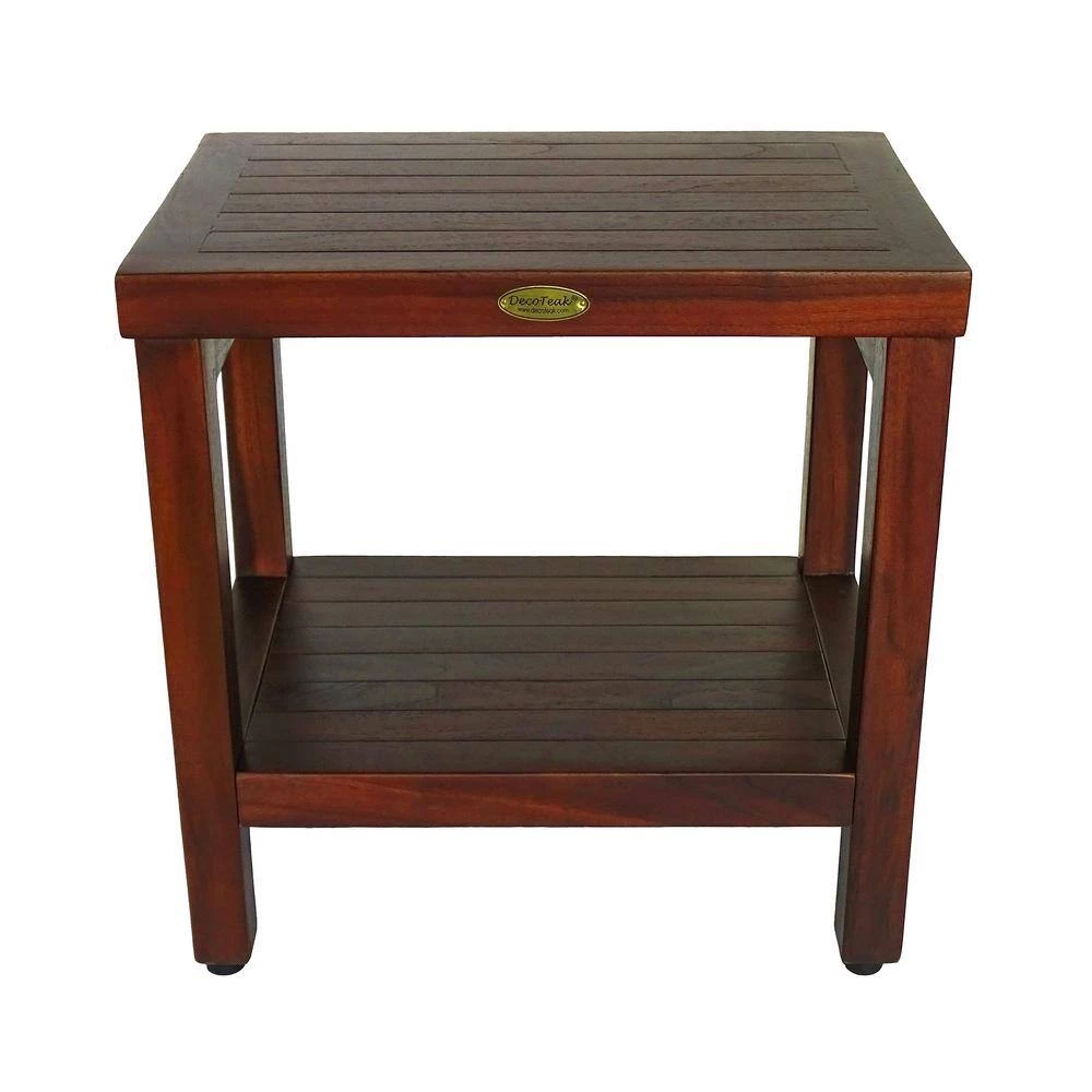 This 18 in. L classic traditional teak shower bench with a contemporary design flair. The included standard utility shelf provides extra storage for toiletries or towels. This compact size of 18 in. L x 13 in. W x 18 in. H provides a compact footprint that will fit in most showers. These stools include foot leveling pads to provide extra flexibility and stability to allow stabilization due to any minor slope in shower floors. Teak is naturally water, mold, and mildew resistant due to its natural density and high oil content. It has been the wood of choice for hundreds of years of luxury boat builders. This natural resistance has been supplemented by using our proprietary DecoTeak stain which is a deep penetrating stain with added mold, mildew, and fungus inhibitors. It provides the ability for this teak furniture to be used outdoors as well as indoors.