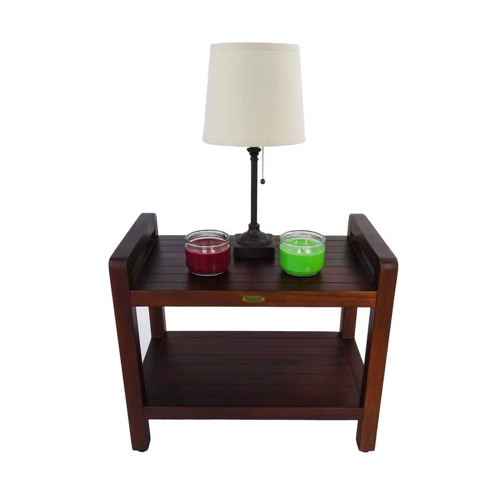 24 in. ergonomic teak shower bench with shelf. LiftAide arms provide support for lifting and sitting from shower chair. Solid teak with slats for water drainage. Adjustable foot pads provide height adjustment for sloped shower floors. Indoor outdoor mold and fungus resistant stain. Use as a shower bench, stool, or shower chair, or use outdoors or indoors. These shower benches have received kudos from healthy young adults, as well as those need a little extra support, mobility, and safety in the shower. Transitioning from standing to sitting is 1 of the most common tasks we do everyday, and also 1 of the most strenuous and physically demanding. Add water, and slippery shower surfaces and you will enjoy the added safety and protection of having support arms provide you. This is the first and only teak shower chair that provides these types of ergonomic and mobility benefits typically found in white plastic medical shower chairs. But DecoTeak shower benches are attractive and modern, and will compliment the most modern of bathrooms, as well as luxurious, while providing the same benefits as medical shower chairs. Some assembly is required, but all tools and hardware is provided, as well as complete instructions and assembly diagrams. All DecoTeak products are provided with a 30-day satisfaction guarantee as well as a 5-year limited warranty.