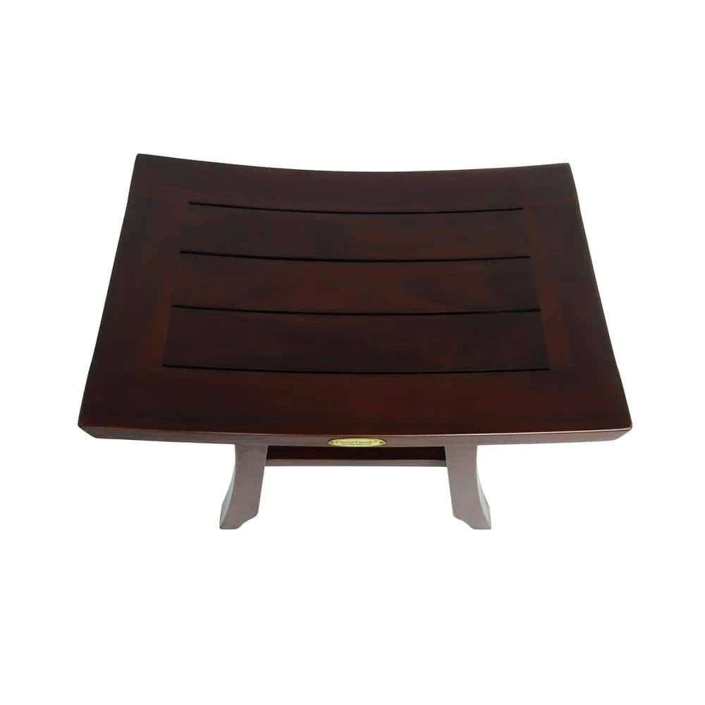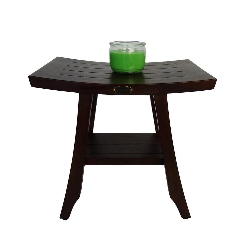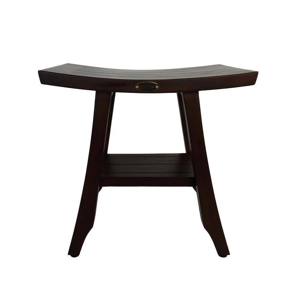 FULLY ASSEMBLED TEAK SHOWER BENCH WITH SHELF- NO ASSEMBLY REQUIRED- SIMPLY TAKE OUT OF THE BOX AND PLACE IN YOUR SHOWER, HOME, OR PATIO. NEW- The newest member of our Patented (D,717,053) Eastern styled solid teak shower stools and benches. The Satori model has a compact design of 12 in. W x 18 in. L x 18 in. H that will fit in small spaces but be fully functional. It is the perfect height to use as a foot rest for shaving, but wide enough and sturdy enough to be a fully functional and comfortable seat. The rich brown indoor outdoor stain allows this to be used in the shower, or anywhere in your house, or for outdoor living. The value of this for 100% solid plantation grown teak is unsurpassed and unbeatable. The included foot leveler pads allow independent adjustment of each leg to make minor adjustments for slight slopes in shower floors. The rubber foot pads also provide an non-slip stable surface for extra stability. In addition the foot leveling pads raise the teak legs off the floor of the shower so that the wood does not stay in contact with water, or damp shower floor surfaces when not in use. This will help prolong the life of the teak. We know that sometimes assembling furniture can be intimidating, especially for our older customers. This is why we provide the option of ordering our products fully assembled. Furniture is often shipped in. knockdown in. or in. flat in. because of the economics of shipping.