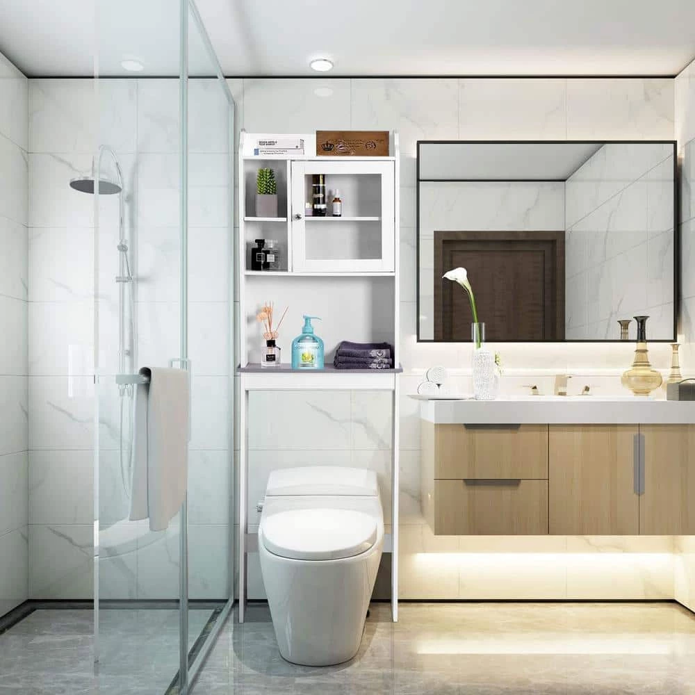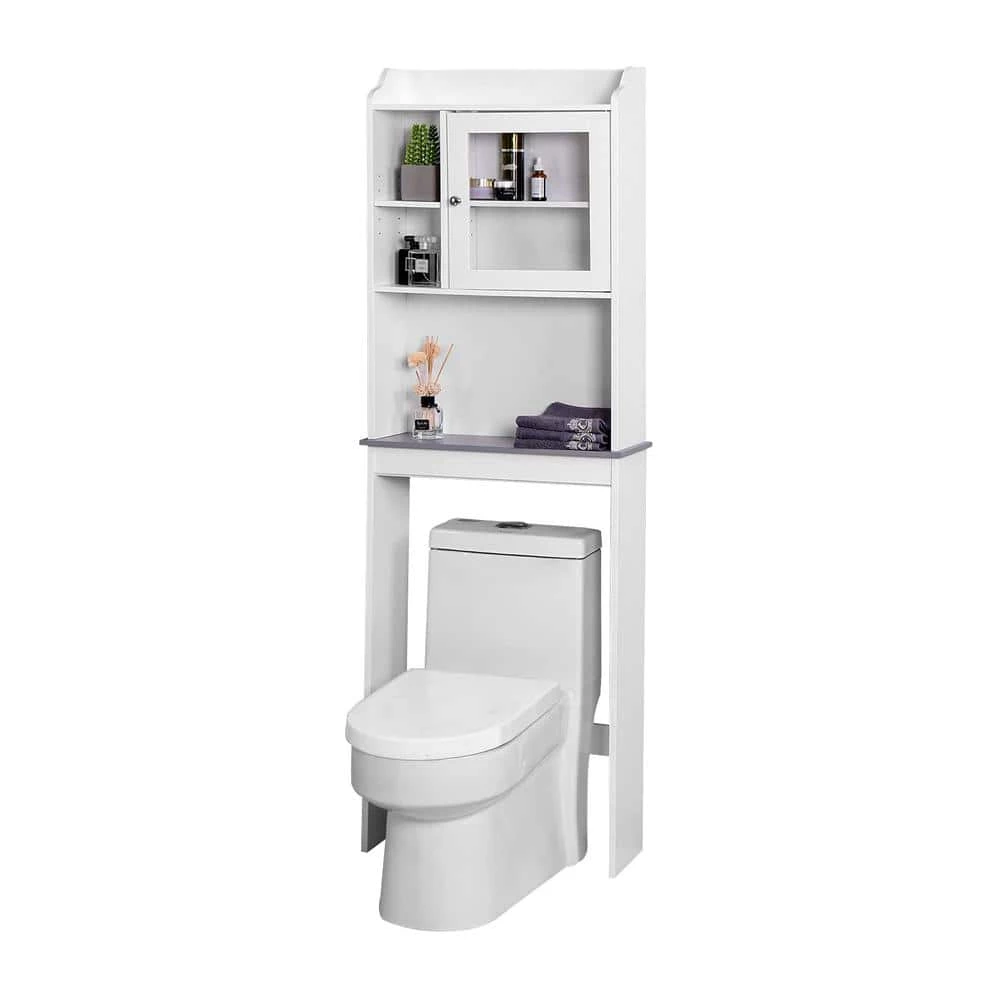 This is space-saving toilet cabinet, which allows you to utilize extra space for all your bathroom storage needs. This shelf is mainly constructed with white paint smooth panels and a black paint faux marble panel. External paint not only makes the toilet shelf more noble and beautiful, but also makes it moisture-proof. Solid and high quality MDF panels guarantee the fastness of the shelf. It supplies you with ample storage space including an enclosed shelf with a door made of glass and 1 open shelf to space a variety of functional and decorative bath items. What’s more, the laminates of open shelf and enclosed shelf are adjustable so that you can adjust the laminate to the height you need. This size of the toilet shelf matches most of the toilets. With this toilet shelf, your bathroom will be tidier and cleaner. If you are in need of such a toilet cabinet, please don’t hesitate to buy it.