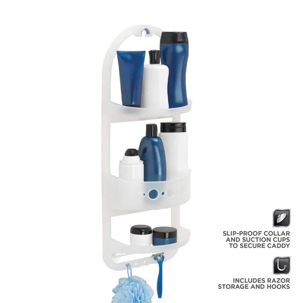 Instantly add more storage space to your bath with the Glacier Bay Large Over-the-Shower Caddy. This rustproof family-sized caddy has a frosted plastic finish and provides a deep basket and two shelves to keep bath essentials within easy reach. The self-draining shelves are easy to clean. (Simply wipe the caddy clean with a damp cloth.) Hooks along the bottom allow for storage of razors, poufs and more. The caddy installs easily over most standard showerheads, with no tools needed. Suction cups hold the caddy securely to prevent swaying or slipping. Glacier Bay customer care is available at 855-HD-GLACIER for additional questions