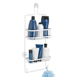 - Includes hooks for hanging storage of razors, poufs, washcloths and more