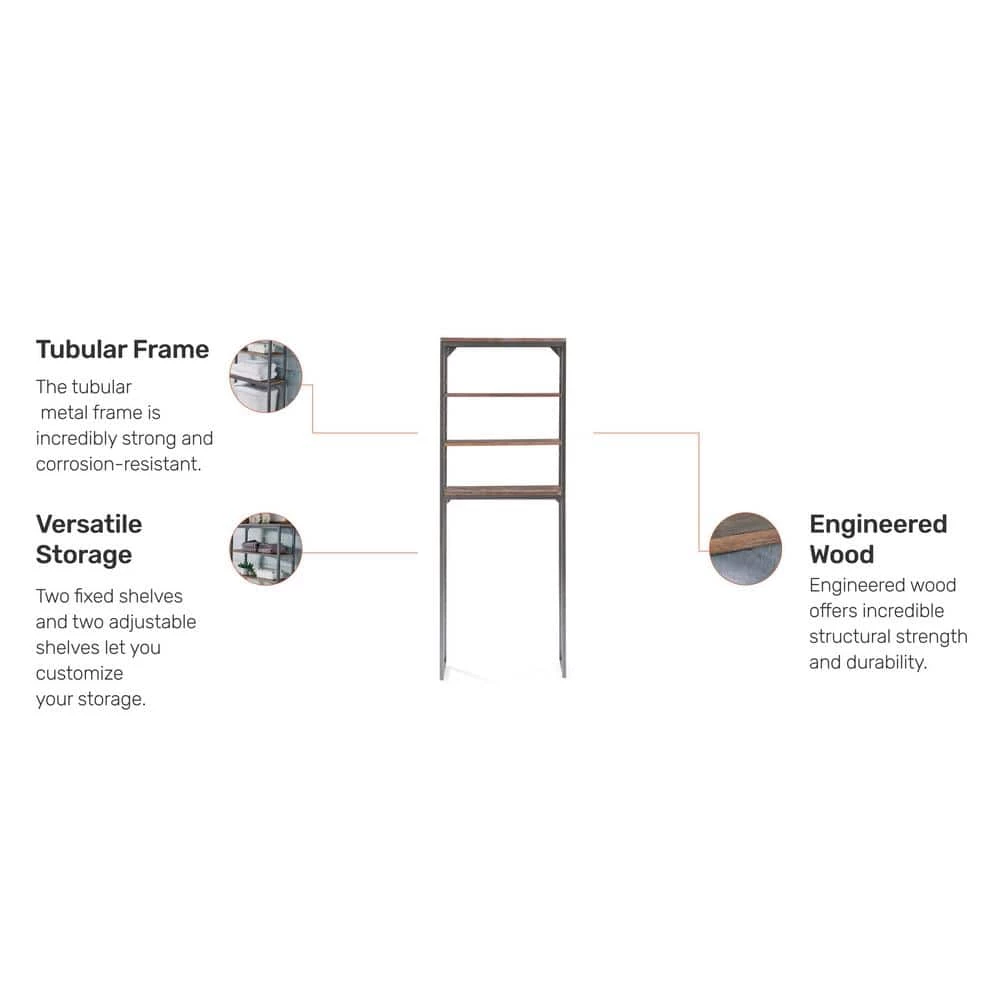 Turn any bathroom into a storage closet by adding this Homestyles Barnside Over-the-Commode Stand. This vertical storage solution stacks two fixed shelves and two adjustable shelves behind the toilet to add convenient storage in an otherwise unusable space. The dark gray wire-brushed finish gives this stand a desirable weathered look, but the powder-coated frame stands the test of time.
