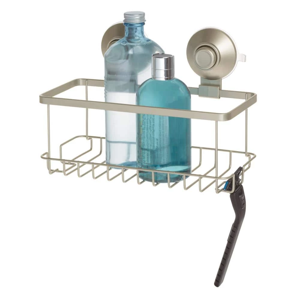 IDESIGN Everett Push Lock Suction Corner Basket in Satin is a great addition to any bathroom. Suction cups move side to side for easy installation. Durable steel construction.