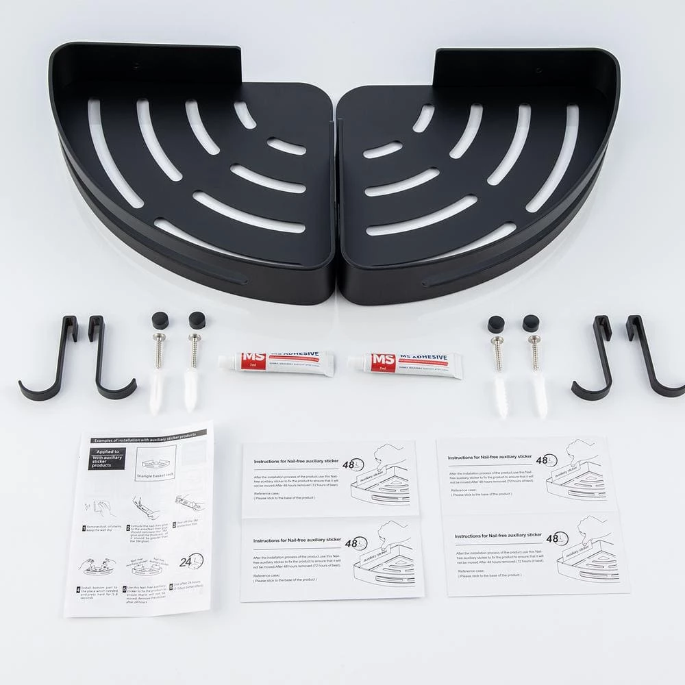 - Packing specification: 2x corner shower caddy, 4x movable hooks, 1x hardware package, 2 bottles of glue and supplementary stickers