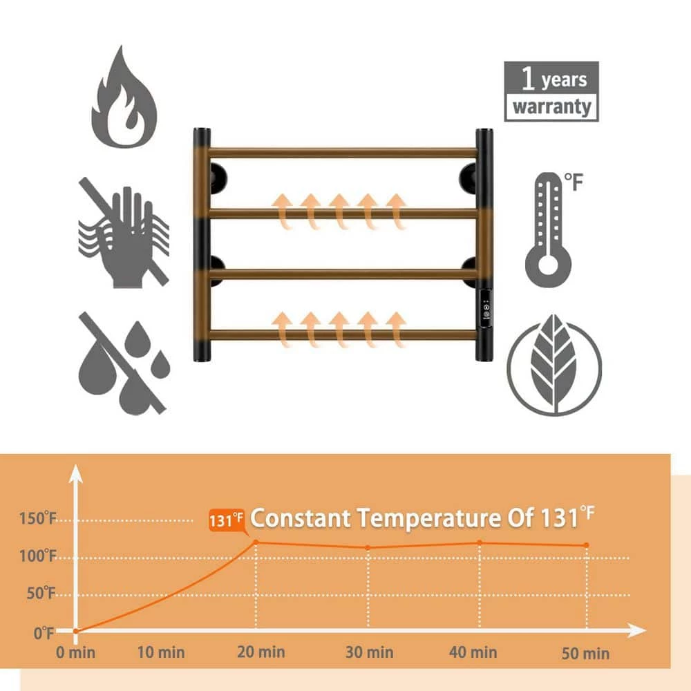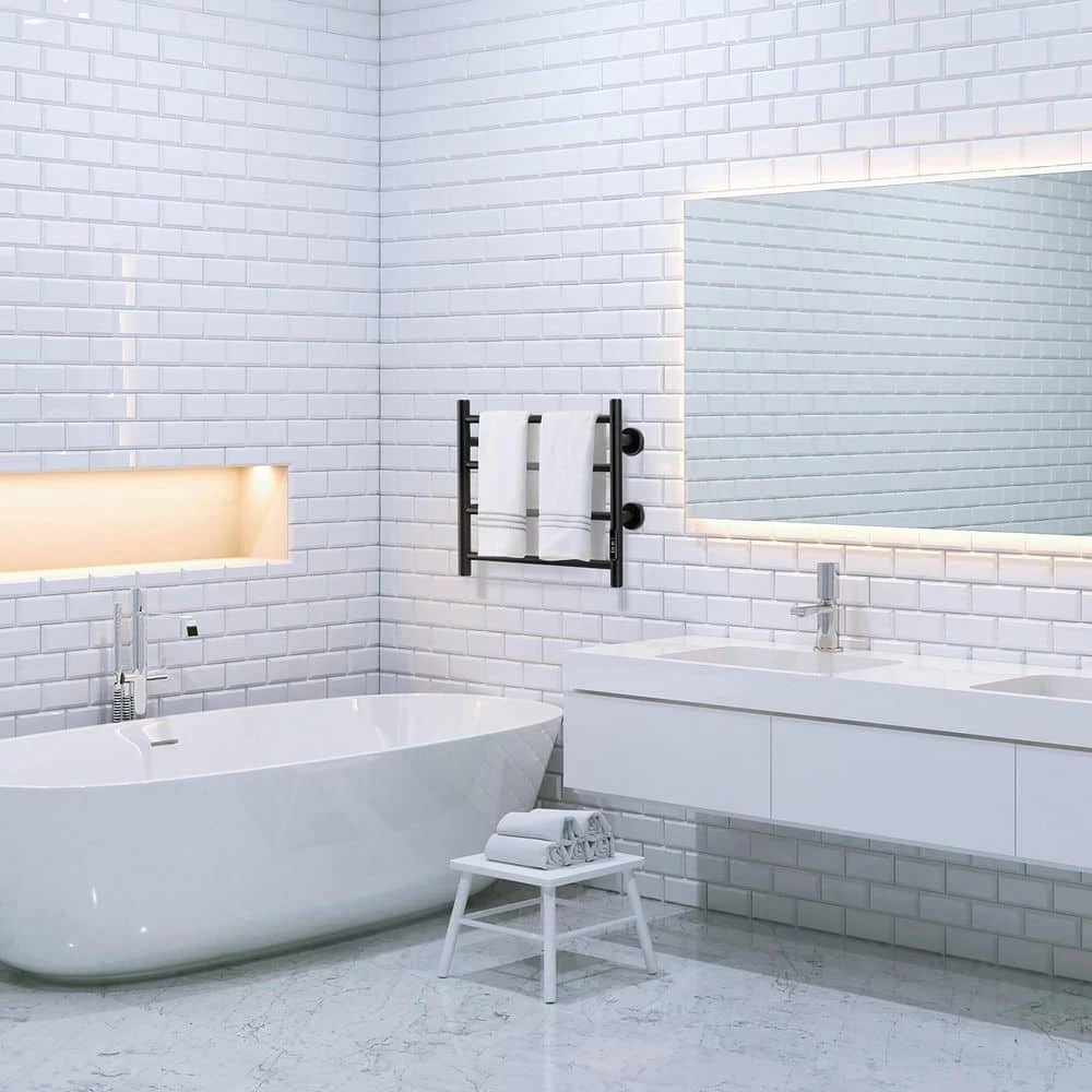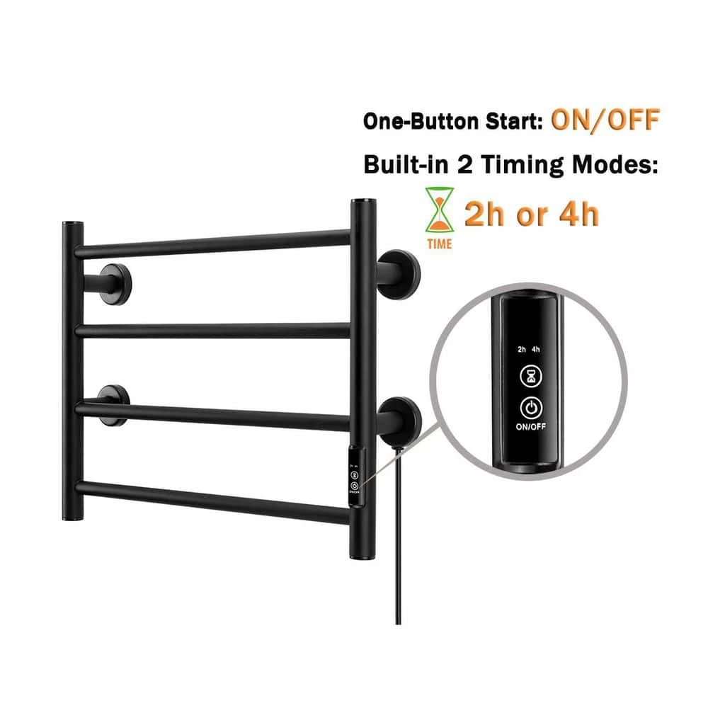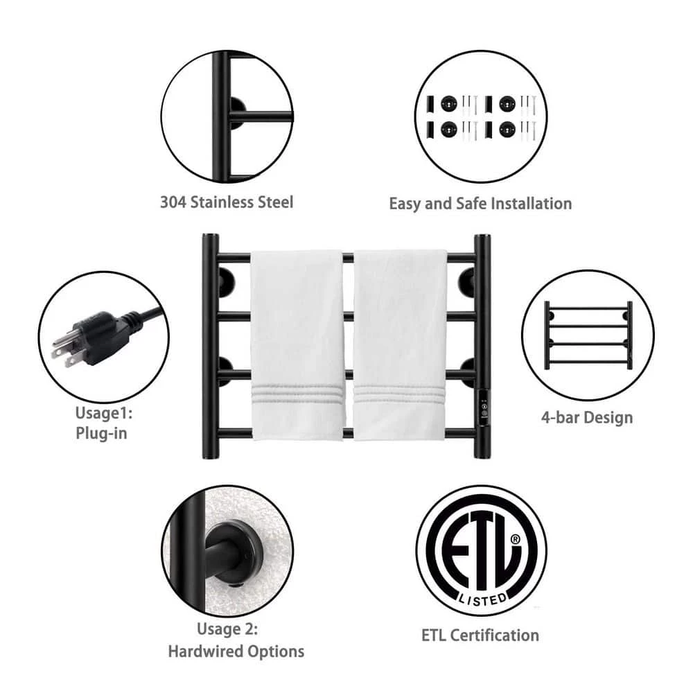 The 4-bar design heated towel rack provides a pleasant, comfortable heating or drying experience, especially during the colder months. Made of durable stainless steel, it is easy to clean and rust resistant. The towel warmer helps heat towels and dry them before use. This helps prevent mold and mildew. The surface temperature of the towel warmer will change with the surrounding temperature. Because this hot towel holder is very energy efficient, it is possible to power it on for a week and it does not consume electricity. The towel rack is the perfect towel heating solution for your home. [Easy Installation] Two plug-in and hard-wired options. Our bathroom heated towel rack is powered by hardwired or outlet power (plug-in) and is rated at AC 120V/60Hz with a 5.9ft power cord. All necessary hardware is included in the package and is easy to assemble.