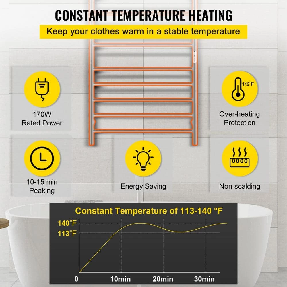 We provide you an advanced electric towel warmer to keep your clothes at a constant gentle temperature even in cold weather. With its help, you will not worry about unhygienic troubles. The VEVOR warmer rack gives you a spacious space to hold many clothes and heats them in a short time. Moreover, thanks to the timer design, the product will ensure convenient and secure use in your daily life.