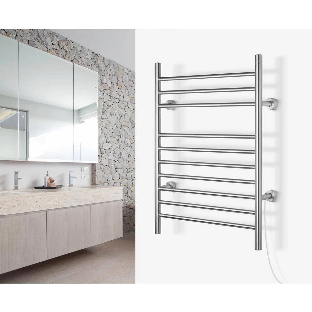 Imagine stepping out of the shower every morning and being able to use fresh-from-the-dryer towels. Now imagine not having to throw your towels in the dryer every morning or run to the laundry room after your shower. The WarmlyYours Infinity electric towel warmer allows you to do just that. With 10-bars, this towel rack is convenient and versatile, with enough space for 2 large towels to be warmed at 1-time. The Infinity towel warmer is made of stainless steel and features a beautiful brushed-metal finish. This model has ten sleek bars, from which you can hang your towels or bathrobe for a cozy, luxurious experience every day. Step out of the shower or bath every day and wrap yourself in freshly-warmed towels. This towel warmer is also dual connection, meaning it can be used “as is” to plug into a standard 120-Volt AC outlet or it can be modified by a licensed electrician to have a hardwired 120-Volt AC electrical connection. And when this towel warmer is installed with a hardwired electrical connection, its unique design means there is no unattractive and cumbersome cover plate required. Additionally, this towel warmer is extremely safe and is cETLus Listed. The Infinity comes with an LED power switch and TempSmart overheat protection to prevent the unit’s surface temperature from exceeding 176°F (80°C). The Infinity is covered by our 2-year manufacturer’s warranty for peace of mind. Optional towel warmer controls sold separately.