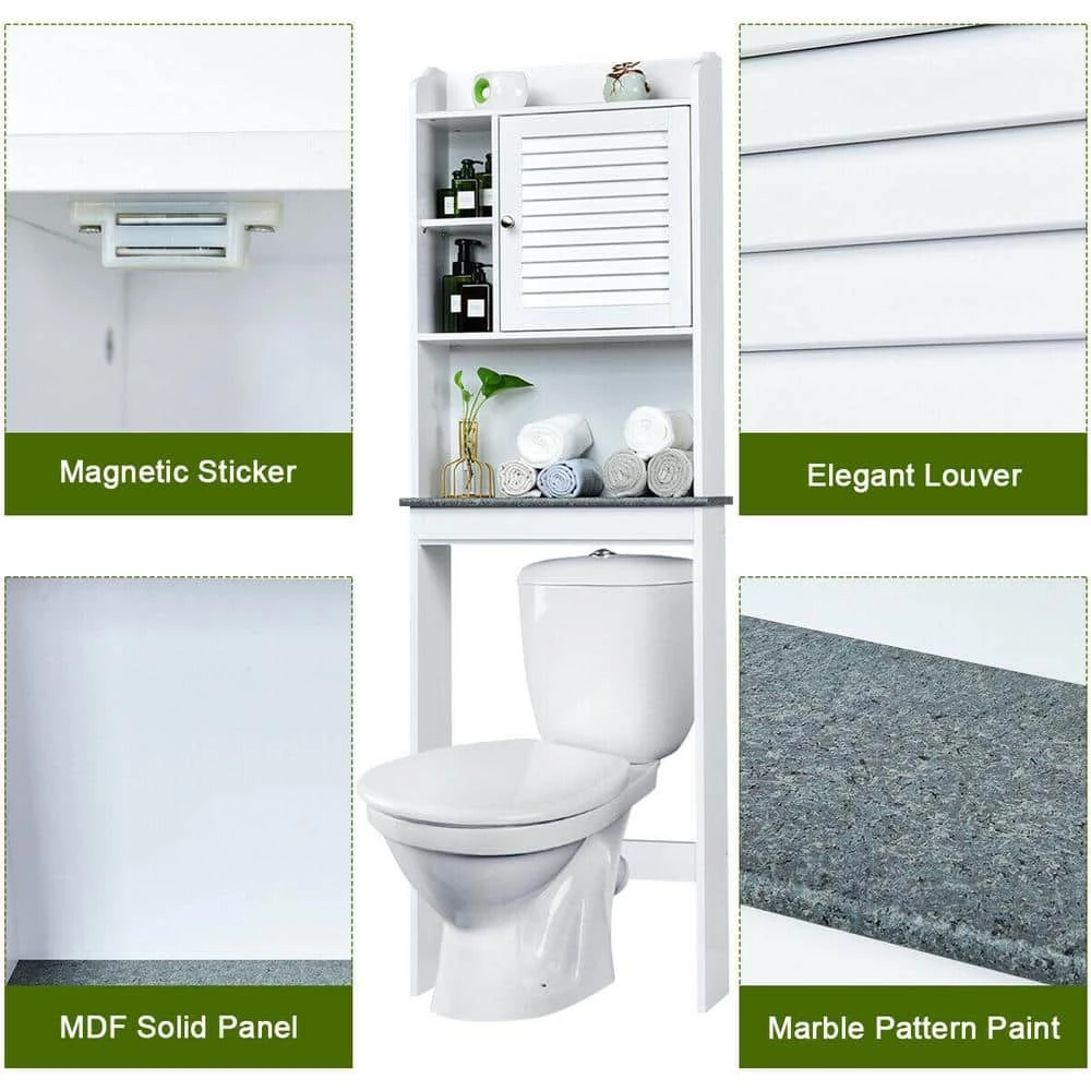This toilet rack is designed with high-quality solid MDF panels to ensure its stability and durability, and the surface coating is waterproof and moisture-proof, easy to clean with a damp cloth. The closed shelf with a shutter door and the open compartment and shelf for storing various bathroom accessories provide sufficient storage space for you to organize and place items in an orderly manner. The white appearance can be generous and beautiful as well as its color and structure can be easily integrated into various indoor styles.