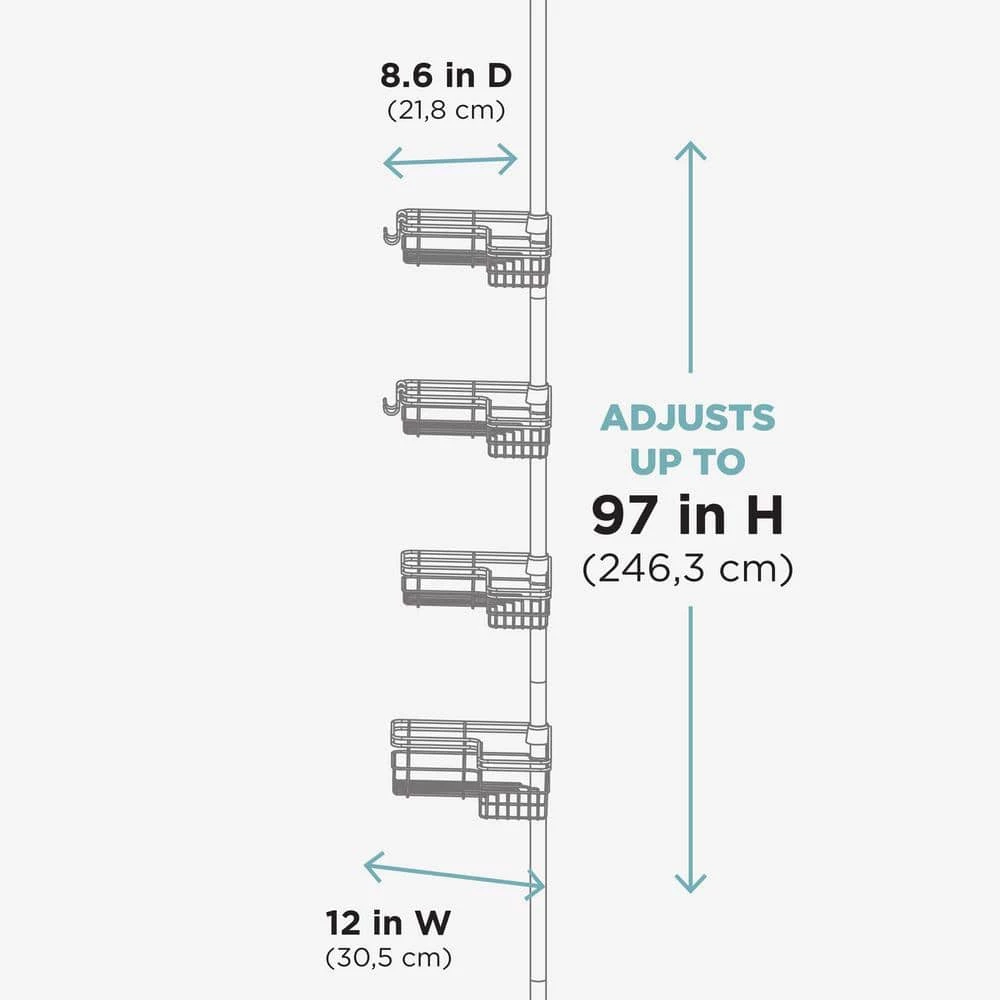 The Zenna Home Tension Pole Shower Caddy’s space-saving design has 4 L-shaped baskets that hug the corner of your shower area to maximize storage. This pole caddy easily adjusts to fit spaces from 60 in. up to a standard ceiling height of 97 in. The pole caddy features easy, tool-free assembly and installation. The rust-resistant tension caddy has an attractive satin nickel finish.